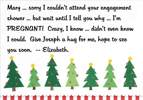 During this time of year we love to hear from distant relatives or friends, maybe through a Christmas Card or Facebook post. Here’s a Christmas Card that Mary’s cousin Elizabeth may have sent her (use your imagination!) …